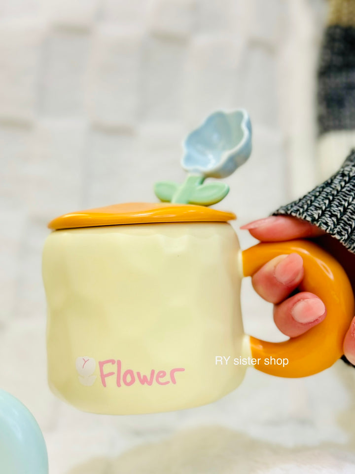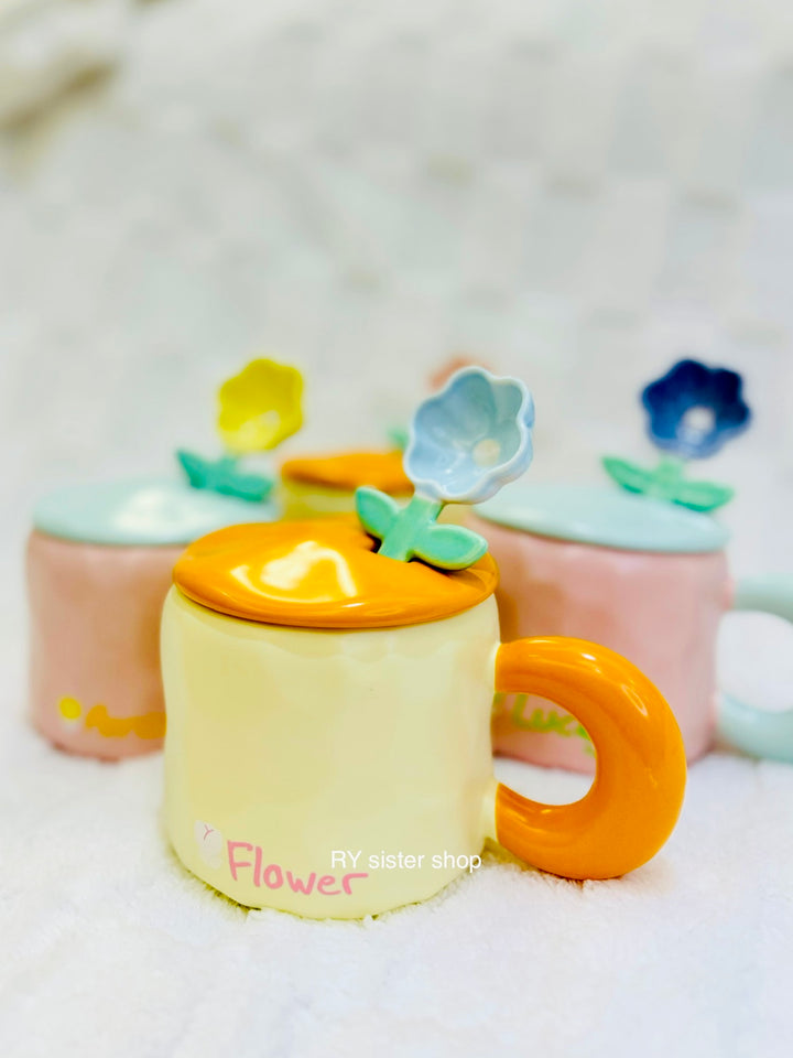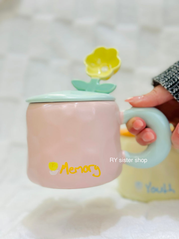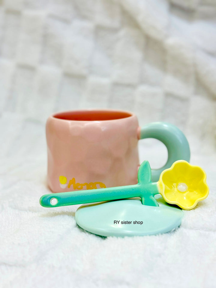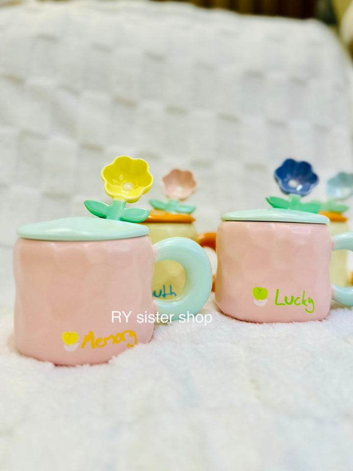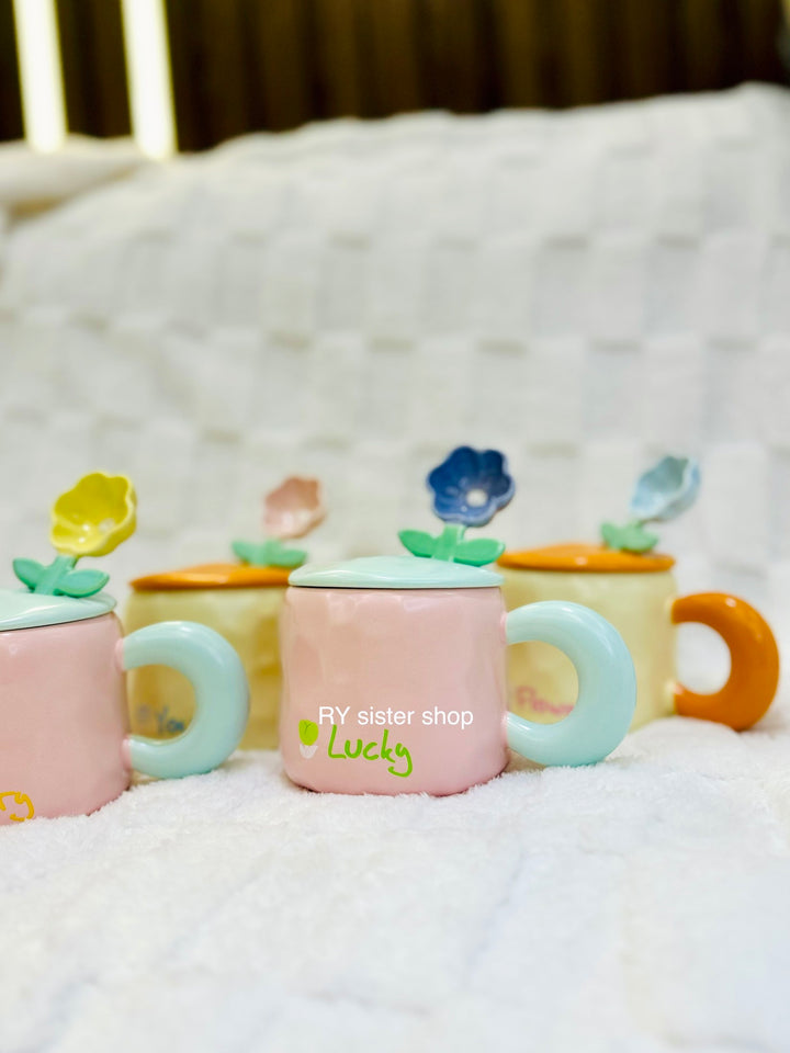 كوب كبير كيوت مع ملعقة وردة وغطاء