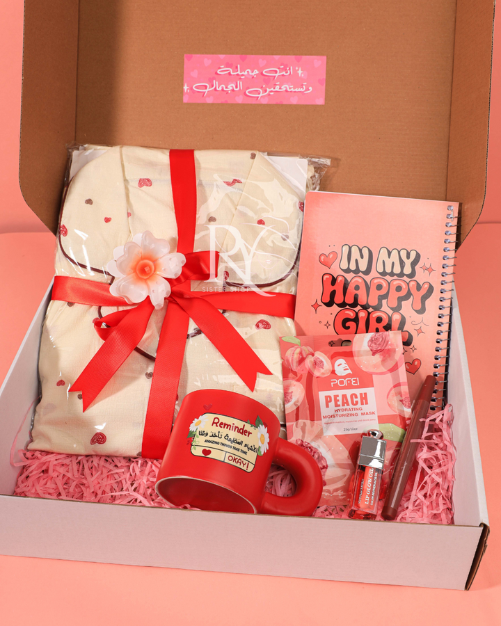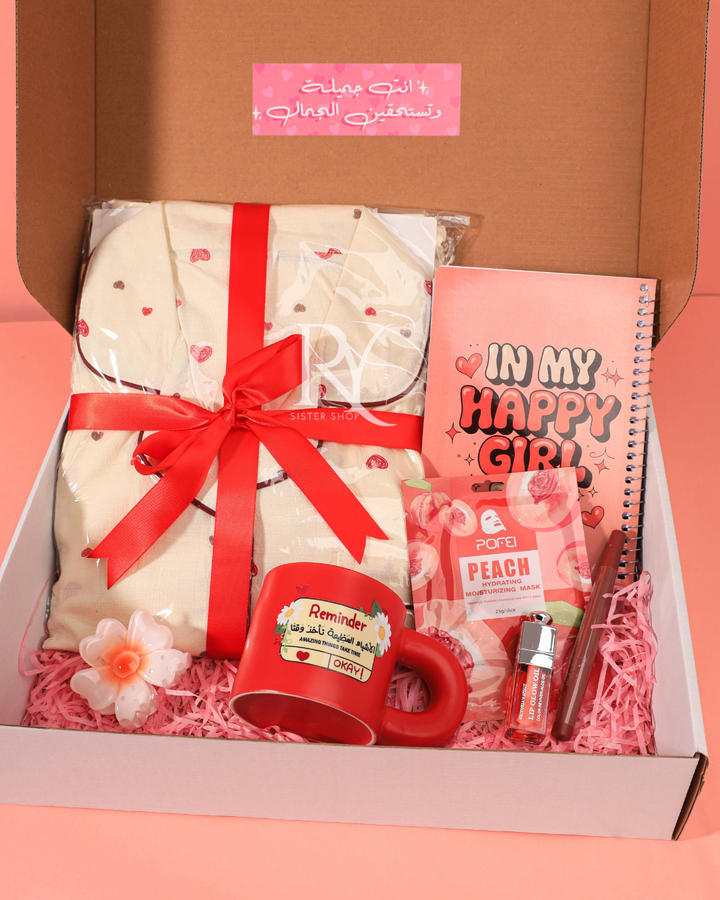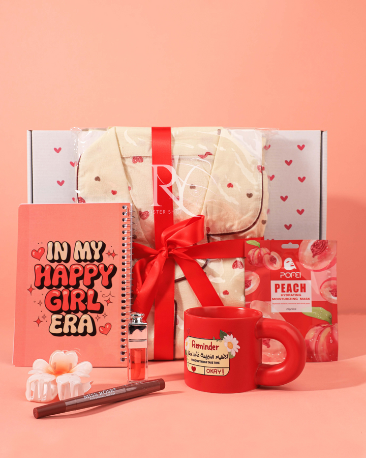 دفتر أنيق مليان طاقة إيجابية، كوب أحمر يذكّرك كل صباح إنك تستحقي الجمال، ماسك مرطب يدلع بشرتك، أحمر شفاه ولمعة تخطف القلوب، وكمان لمسات صغيرة بتقول: أنتِ جميلة وتستحقين كل الحلو.