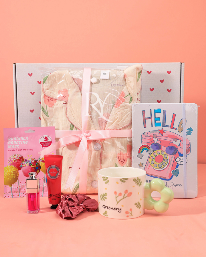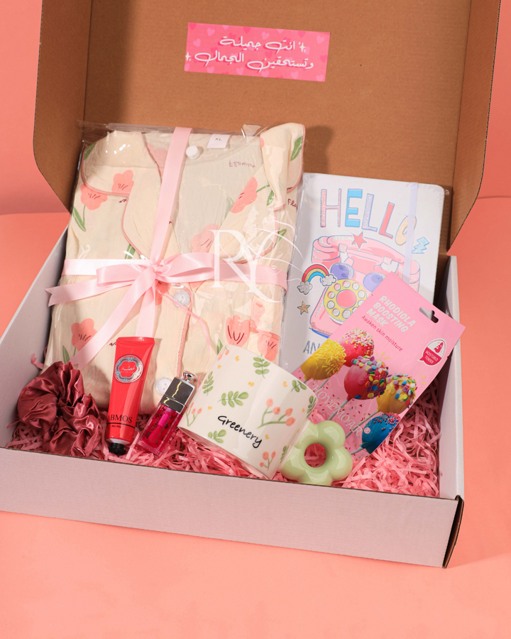 فيه كل التفاصيل اللي بتشبه الورود: بيجاما ناعمة بطبعات زهرية، كوب أنيق بلمسة خضراء طبيعية، دفتر بألوان مبهجة، ماسك بخلاصة النباتات لتغذية البشرة، ومعاهم مستحضرات صغيرة تكمّل الدلال وتضيف إشراقة 💕