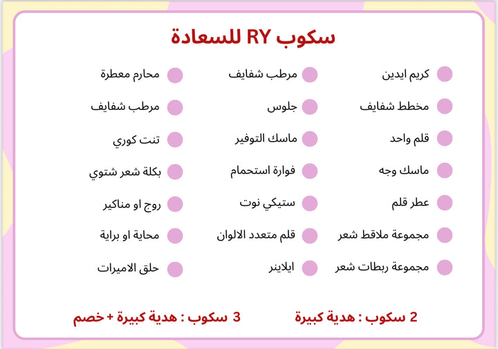 أعلم بأن هذا المنتج عشوائي والمنتجات تأتي من القائمة المرفقة بالصورة وتبعاً للخرز واوافق أنه اذا ما كتبت الملاحظة لا يمكن التعديل |
