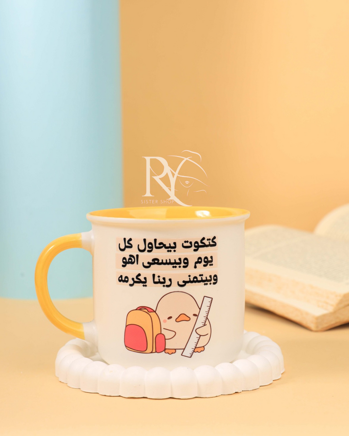 مج زجاجي باللون الأبيض والاصفر مع عبارة كتكوت بيحاول كل يوم وبيسعى اهو وبتمنى ربنا يكرمه